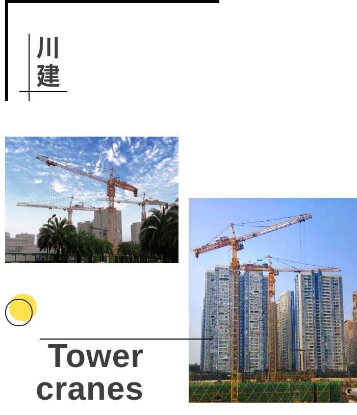 川建M1000hth(中国)起重臂长70米,最大吊重50吨,端部吊重12吨,塔身截面4米;川建C8039hth(中国)起重臂长80米,最大吊重25吨,端部吊重3.9吨,塔身截面2.5米;两种机型均具有行走式、固定式两种基础形式。