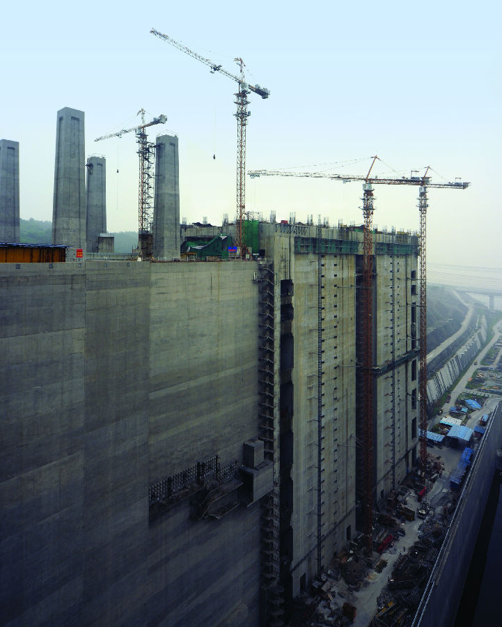 在此次升船机建设施工中,使用了川建2台C7030和2台F0/23B塔机,用于升船机坝体浇筑,钢筋、模板吊装等作业。另有4台川建SC系列施工升降机用于施工人员的运送及施工物品的装载。其中C7030塔机最大起重力矩274吨米,最大起重量16t,端部吊重3t,工作幅度70米,2台塔机均固定附着式,附着在升船机坝体,附着高度达到185米。F0/23B塔机为标准高度的行走式,最大起重力矩132吨米,最大起重量10t,端部吊重2.3t,工作幅度50米。而4台施工升降机均为SC200/200W,使用了德国先进的SEW施工升降机专用电机减速器,其单笼功率为3×11kW,并采用变频控制,PLC逻辑处理,通过采集操作运行中的各种信号进行综合逻辑分析,使升降机的运行更为平稳、安全可靠。吊笼尺寸为3×1.5×2.7米,、便于体积较大物料运输。川建升降机均对吊笼、标准节、附墙等结构进行了大量的优化设计,使得结构更加合理、整机更加安全可靠。