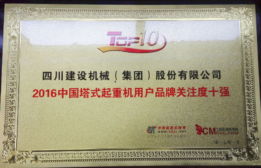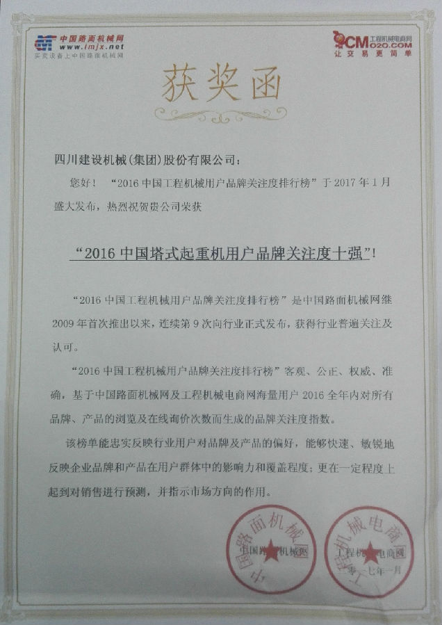 2017年1月3日,中国路面机械网和工程机械电商网在北京发布“2016中国hth(中国)用户关注度排行榜”,四川建设机械(集团)股份有限公司进入“2016中国hth(中国)用户品牌关注度排行榜”前十强,排名第二位。