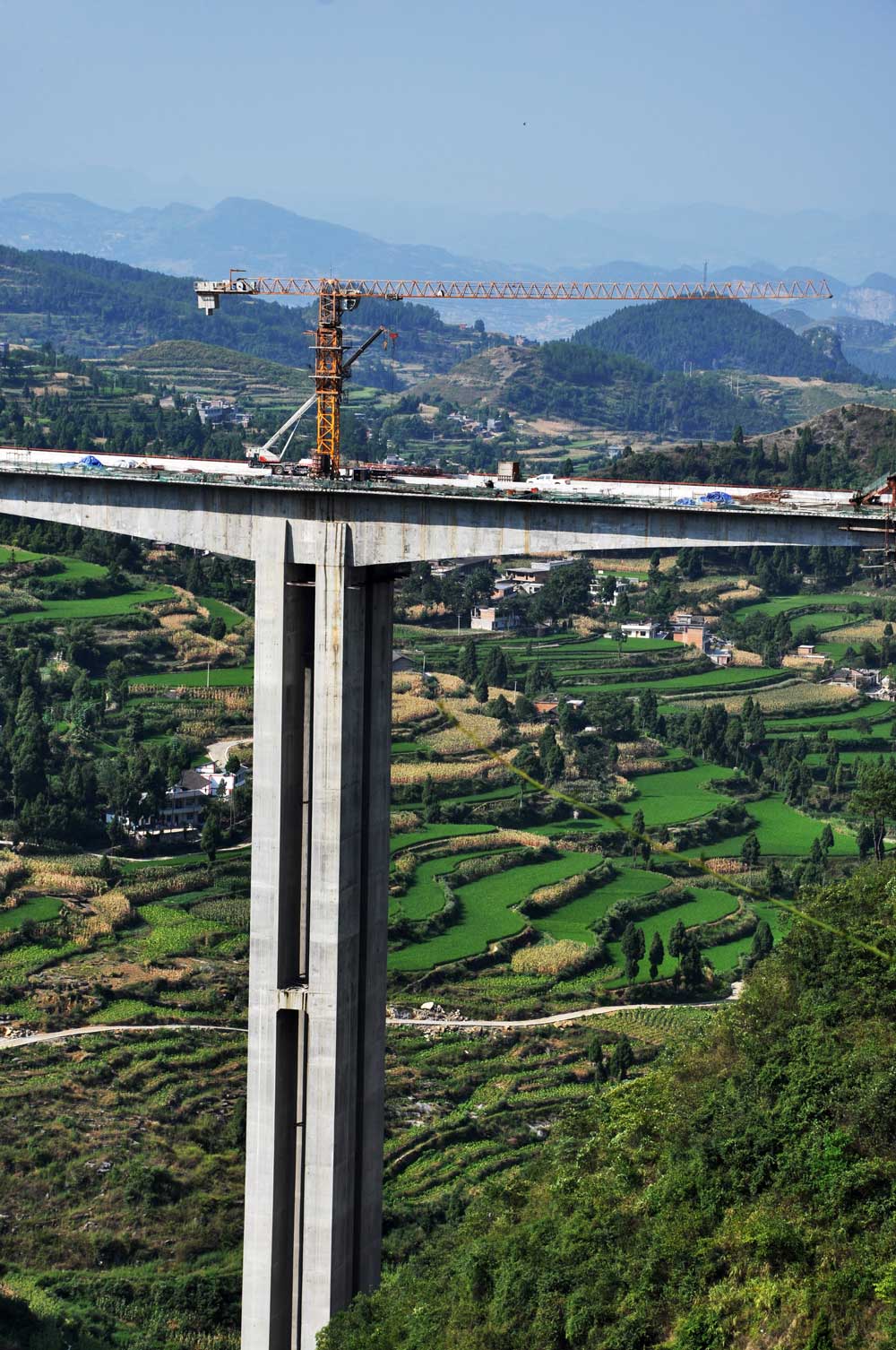 关寨大桥,全长998.08米,最大墩高102米。参与该桥施工的P125hth(中国)为固定附着式,起升高度达120m,最大吊重10t,端部吊重1.5t,最大工作幅度60m,标准节采用2m断面,是四川建设机械(集团)股份有限公司自行设计研发的新型平头式塔机,该机采用LVF变频起升机构,X系列变频调速变幅机构,RCV回转变幅调速机构,机构的配置均为公司多年来潜心研制的,具有国际同类先进水平的技术性能,运行平稳、操作简便、构造简单、故障率低、维护方便、安全可靠。