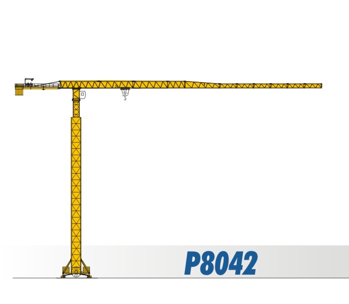 臂长组合:80m 75m 70m 65m 60m 55m 50m 端部吊重:2.9t(80m)/4.2t(80m) 最大吊重:25t(17.3m)